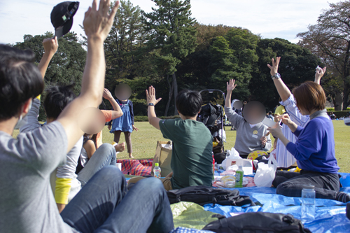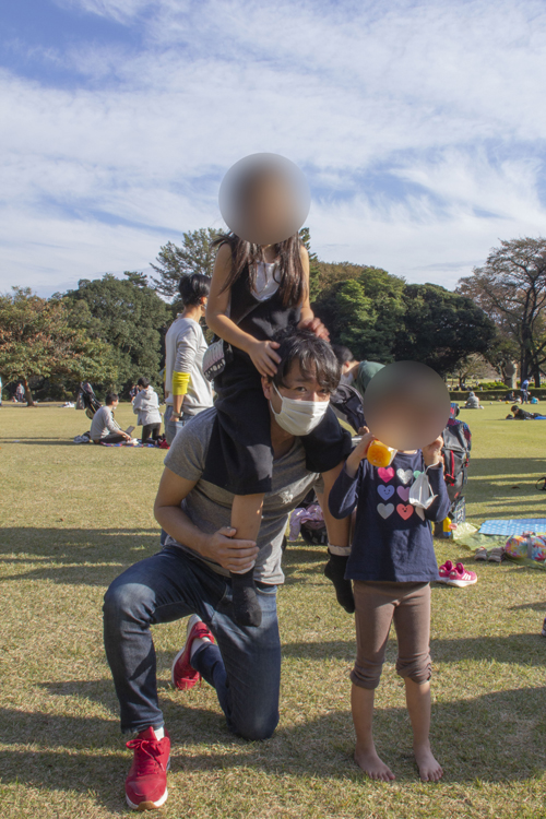 松中権さんや、虹色ダイバーシティ有田と子どもが遊ぶ場面も。その間、保護者の皆様はつかの間の休憩。晴れた新宿御苑で、リラックス!